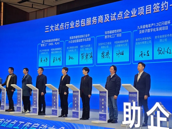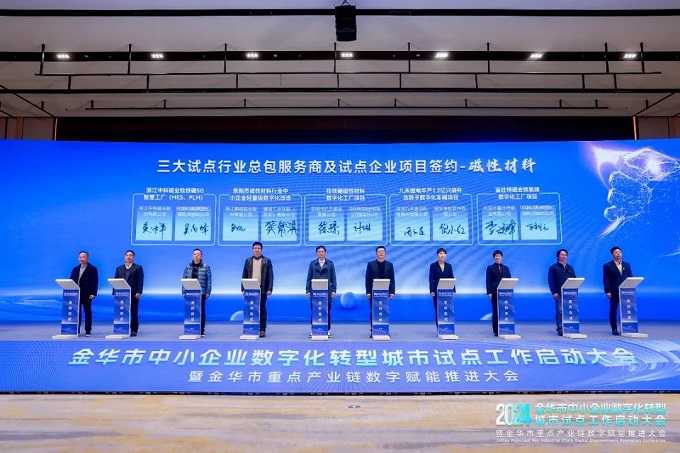 金華金辰作為此次金華市中小企業(yè)數(shù)字化轉(zhuǎn)型城市試點(diǎn)總包服務(wù)商(電動(dòng)工具、磁性材料),倪小紅女士代表參與了此次啟動(dòng)儀式。在啟動(dòng)會(huì)上與磁性材料試點(diǎn)企業(yè)——九禾磁電進(jìn)行項(xiàng)目簽約,率先開展數(shù)字化轉(zhuǎn)型實(shí)踐。標(biāo)示著金華金辰在金華政府的支持下,將逐步探索出一條符合本地中小企業(yè)實(shí)際情況的數(shù)字化轉(zhuǎn)型特色之路,為中小企業(yè)數(shù)字化轉(zhuǎn)型提供有效金華經(jīng)驗(yàn)!