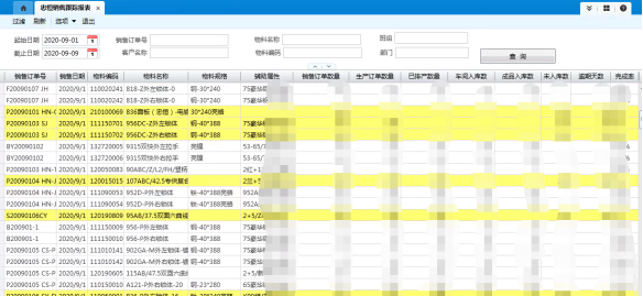 通過二開報表的方式,增加了銷售訂單跟蹤表,通過該表可直觀看到銷售訂單的生產排產、入庫等情況,包括逾期未入庫時間等,并通過不同的顏色顯示,可直觀看到每個訂單的狀態(tài),更利于管理人員對訂單的跟蹤及管理。
