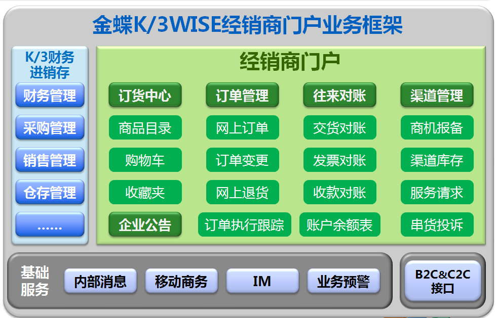 經(jīng)銷商管理系統(tǒng)主要以K/3WISE經(jīng)銷商門戶模塊為主,介紹經(jīng)銷商如何通過經(jīng)銷商門戶進行溝通、訂貨、退貨、對賬等,形成金蝶K/3WISE經(jīng)銷商門戶解決方案。